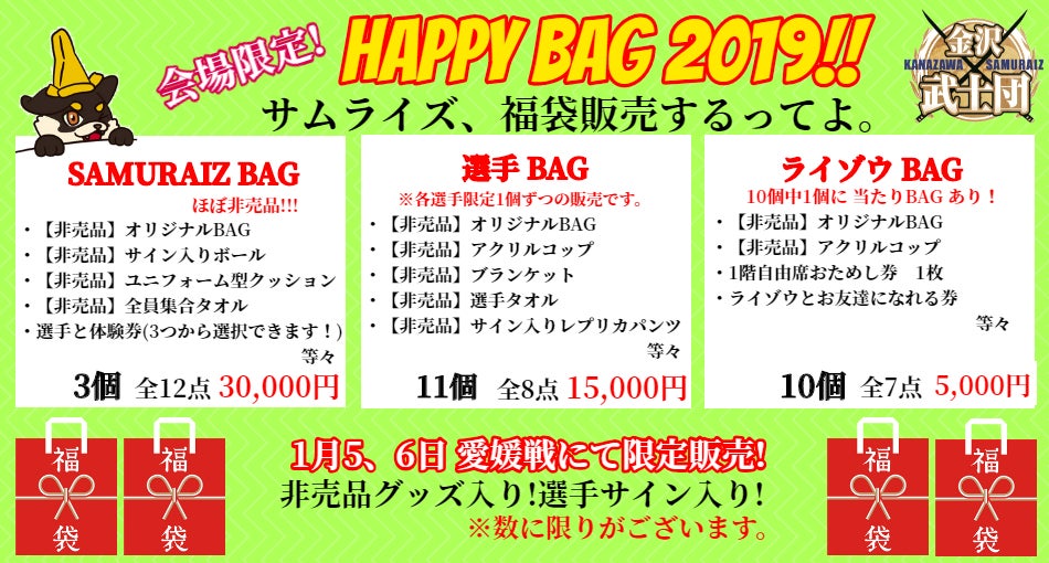 金沢武士団の「オリジナル福袋」を2019年最初の試合、1月5日(土)6日(日)金沢市総合体育館にて開催される愛媛オレンジバイキングス戦会場で販売いたします!