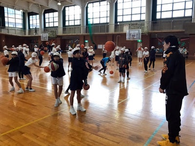 今回の「プロスポーツ出前教室」では、ボールハンドリング、シュート練習を行い、選抜された2チームと選手達がミニゲームをし、バスケットボールと体を動かすことの楽しさを伝えました。