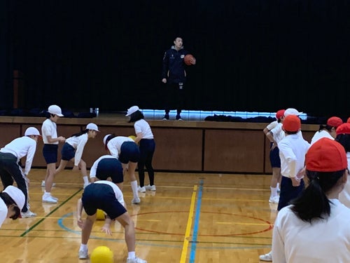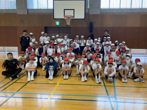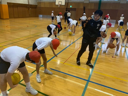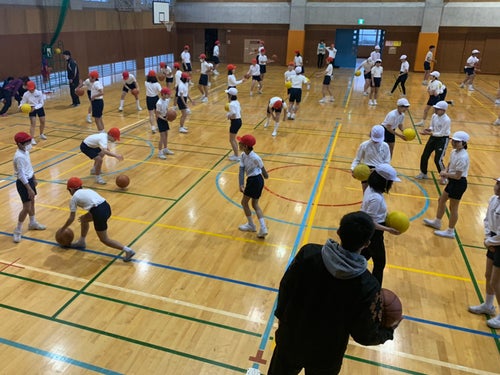 今回の出前教室では、武田選手を中心にボールの扱い方、ドリブルのつき方などを指導し、ドリブルとシュートに関してはチーム分けをして競争をしました。