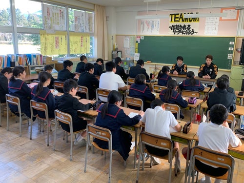 職業講話では、与那嶺選手・木田選手が、プロになった経緯、これからも感謝の気持ちを持ち続けることの大事さを話しました。