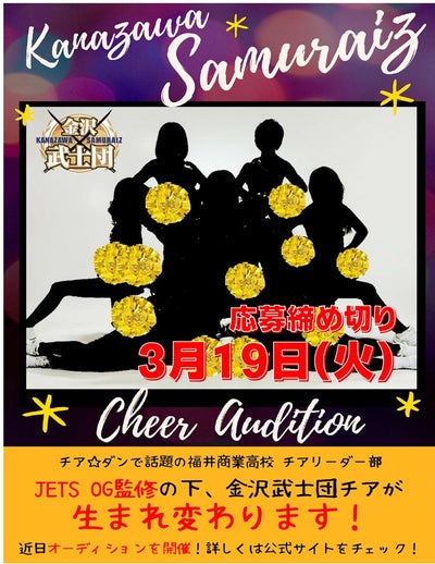金沢武士団では、ホームゲームを一緒に盛り上げてくれるチアダンスメンバーを募集いたします。会場をそして地域を盛り上げたいという熱い気持ちをお持ちの方であれば応募可能です。