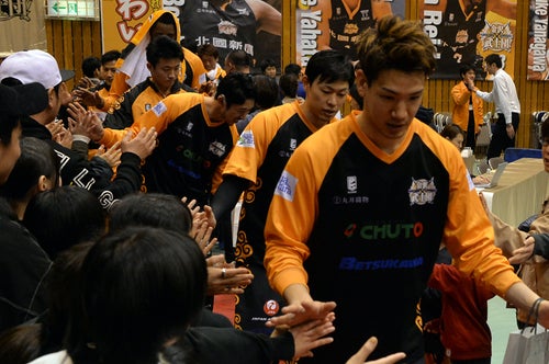 4月14日(日)の試合終了後に行われる大集合写真撮影後、1Fアリーナ出口にて、退出される皆様を全選手がハイタッチでお見送りします。