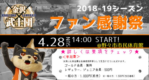 金沢武士団では、4月28日(日)に開催されるファン感謝祭のイベント詳細が決定しましたのでお知らせします。なお、ファン感謝祭の参加申込受付は終了しています。