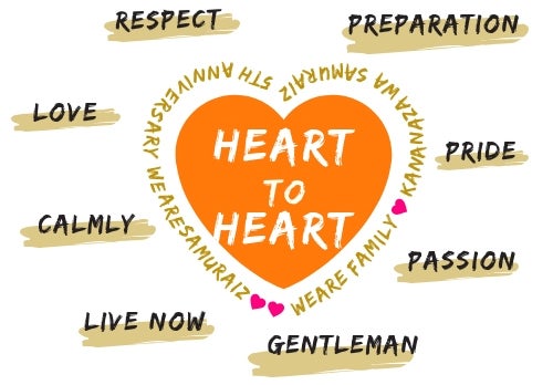 「我々はチームであり、家族でもある。一人一人の力がとても大切である。お互いにRespect(尊敬)し合い、協力すること。サムライズファミリー(ブースター、スポンサー、ボランティア、選手、RAIZO、チアリーダー、フロント、スタッフ)で闘う」