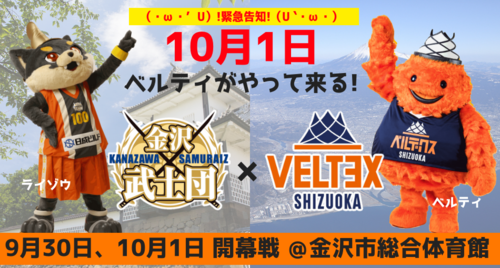 金沢武士団では、10月1日(火)金沢市総合体育館にて行われる2019-20シーズン開幕節ベルテックス静岡戦のGAME2に、ベルテックス静岡のマスコットキャラクター「ベルティ」が来場することとなりましたので、お知らせいたします。