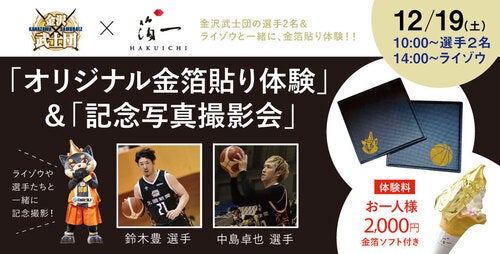 金沢武士団では、オフィシャルパートナー「株式会社箔一」様にて「オリジナル金箔体験」&「記念写真撮影会」開催され、鈴木豊選手、中島卓也選手、ライゾウが参加することとなりましたのでお知らせいたします。