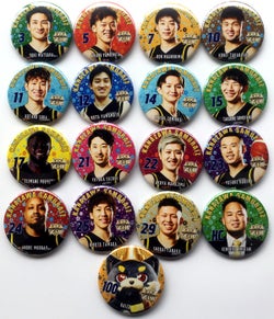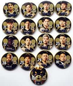 今回の缶バッチのデザインは、全選手+飴谷ヘッドコーチ+ライゾウが「笑顔」と「真剣な表情」の2パターン・全34種類となります。