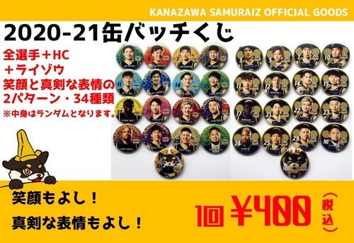 金沢武士団では、4月29日(木・祝)金沢市総合体育館にて行われる鹿児島レブナイズ戦会場より、新グッズ「2020-21缶バッチくじ」を販売開始することとなりましたので、お知らせいたします。