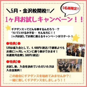 金沢武士団チアダンスアカデミーでは、5月より金沢校の開校を記念して下記の内容にて「1ヶ月お試しキャンペーン」を実施いたします。