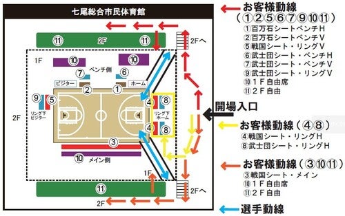 金沢武士団では、5月15日(土)16日(日)七尾総合市民体育館にて行われるトライフープ岡山戦において、感染症対策のため下図の通りにお客様とチームの動線を分ける運用をいたしますので、お知らせいたします。