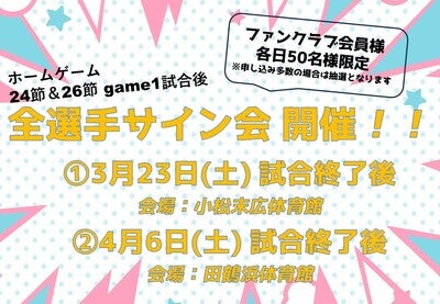 3/23(土)、4/6(土) の各試合後に、2023-24シーズン ファンクラブ会員様を対象に 全選手参加のサイン会を開催いたします。