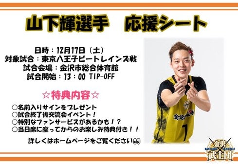 金沢武士団では、12月17日(土)金沢市総合体育館にて行われる東京八王子ビートレインズ戦にて、「山下 輝 選手シート」の受付を下記の日程より行うこととなりましたのでお知らせいたします。