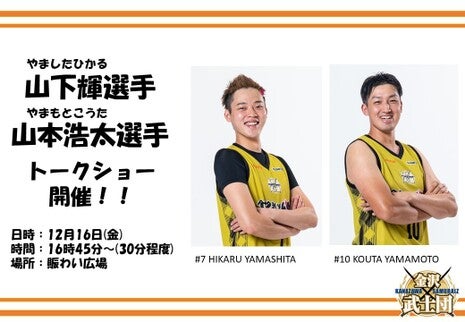 金沢武士団では、12月16日(金)金沢市総合体育館にて開催される東京八王子ビートレインズ戦にて、山下輝選手、山本浩太選手のトークショーを実施することとなりましたので、お知らせいたします。
