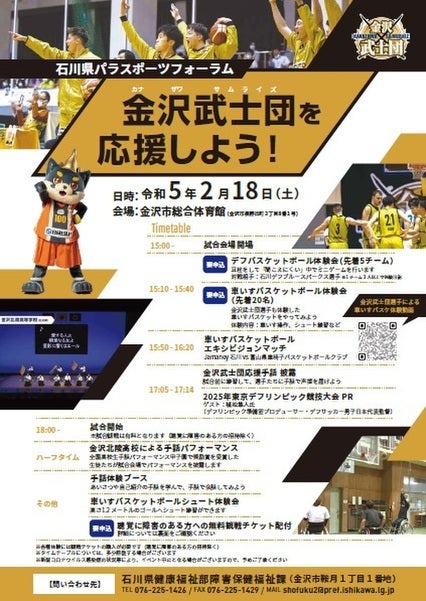 この度、金沢武士団では、2月18日(土)金沢市総合体育館にて行われる横浜エクセレンス戦にて、石川県様及び石川県障害者スポーツ協会様ご協力のもと、パラスポーツの普及促進や手話に対する理解促進を図る「石川県パラスポーツフォーラム 金沢武士団を応援しよう!」を開催いたします。