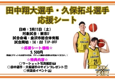 金沢武士団では、3月11日(土)金沢市総合体育館にて行われる東京ユナイテッドバスケットボールクラブ戦 GAME2にて、「#11 田中翔大選手・#21 久保拓斗選手応援シート」を行うこととなりましたのでお知らせいたします。