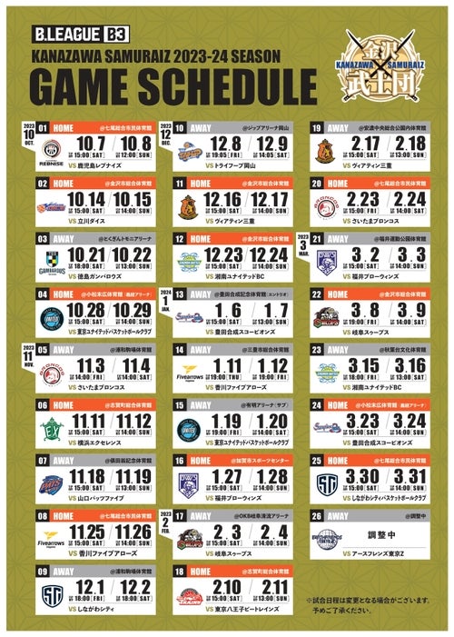 金沢武士団では、2023年10月から始まるB3リーグ 2023-24シーズンの、試合日程が決定いたしましたのでお知らせいたします。