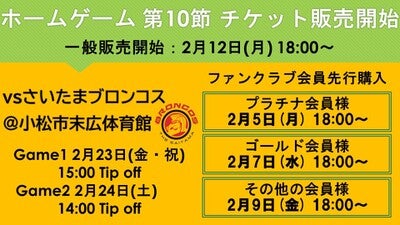 ※第10節 vsさいたまブロンコスにつきましてはチケット販売期間の都合上、一般販売、ファンクラブ先行購入期間を下記の通り変更とさせていただきます。申し訳ございませんがご了承ください。