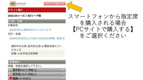 購入ページにて下記画像右上部分にある『PCサイトで購入する』を選択していただけますと、スマートフォンからでもチケット購入時、指定席の座席の選択を行うことが可能となります。