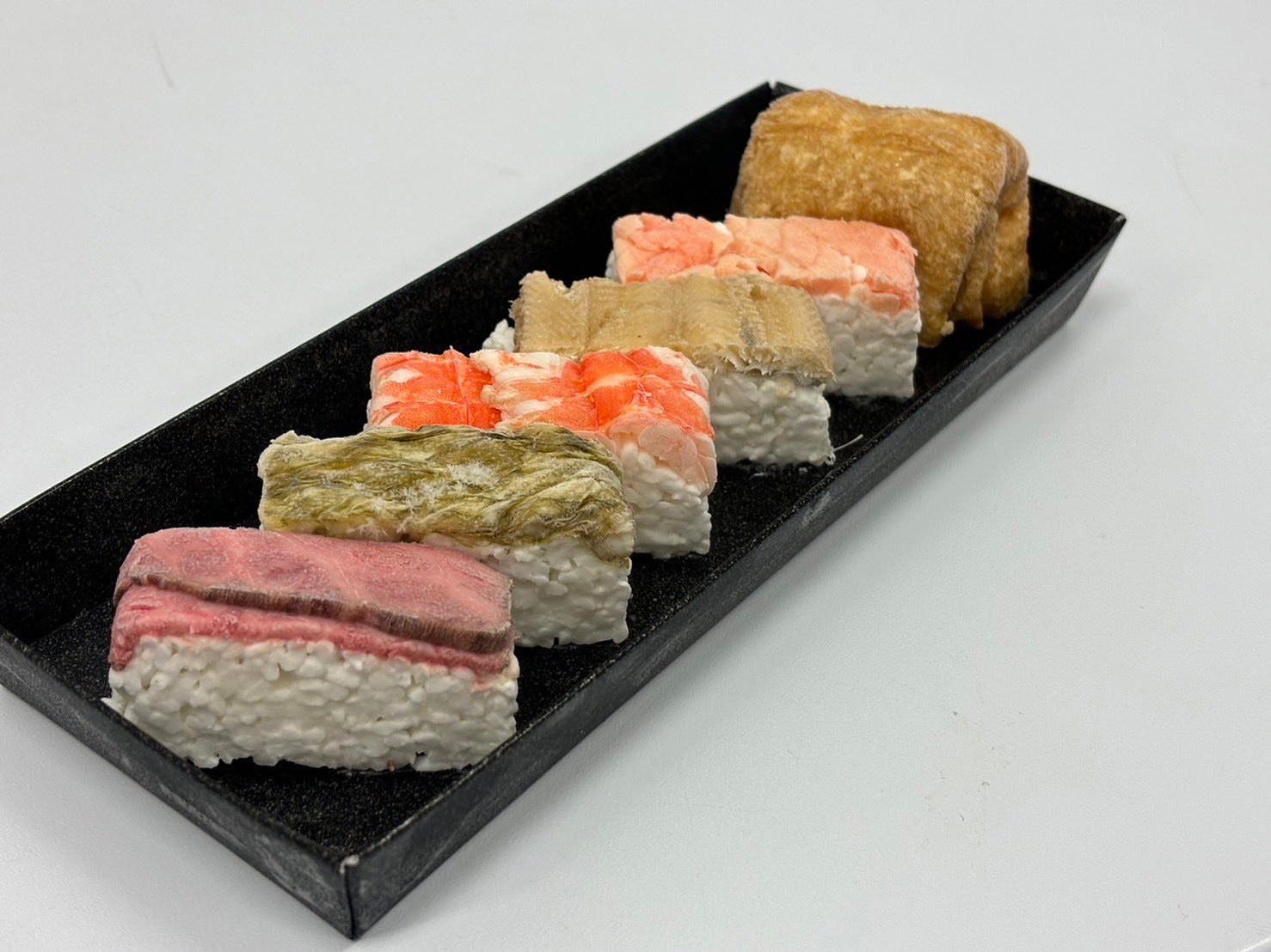 寿司ネタ: 能登牛ローストビーフ、ガス海老昆布締め、蒸しえび、穴子、ます、数の子いなり