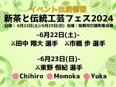 この度、6月22日(土)、23日(日)の二日間、加賀市打越町にて開催される【新茶と伝統工芸フェス2024】に選手、チアリーダーが参加いたしますのでお知らせいたします。