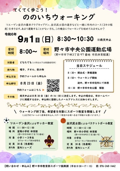 金沢武士団では、9月1日(日)に野々市市内にて行われるウォーキングイベント【てくてく歩こう!野々市ウォーキング】に選手が参加することとなりましたのでお知らせいたします。
