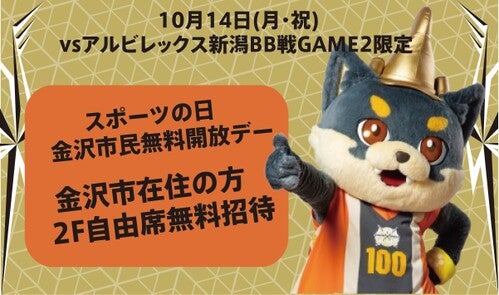 10月14日(月・祝)に開催するホームゲーム第3節 新潟アルビレックスBB戦は金沢市との取り組みの一環として本試合を【スポーツの日 金沢市民無料開放デー】とし、金沢市民の皆様を2F自由席へ無料招待いたします。申し込み方法は後日お知らせいたします。