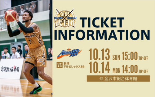 金沢武士団では、第3節となる10月13日(日)14日(月・祝)開催のB3 2024-25シーズン 第3節 vs新潟アルビレックスBB戦 チケット販売について下記の概要にて販売開始いたしますのでお知らせいたします。