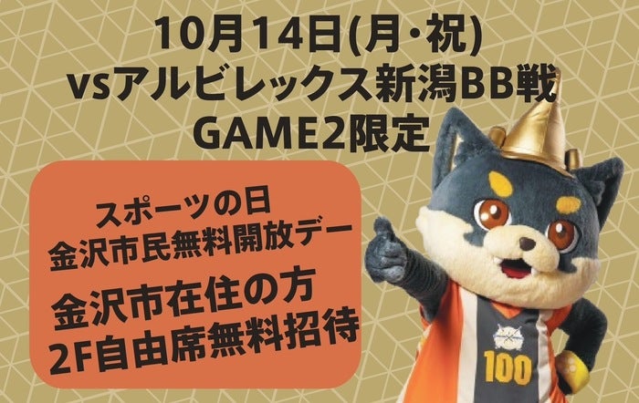 10月14日(月・祝)に開催する、ホームゲーム第3節 新潟アルビレックスBB戦GAME2では、金沢市との取り組みの一環として、本試合を【 スポーツの日 金沢市民無料開放デー 】とし、金沢市民の皆様を2F自由席へ無料招待いたします。