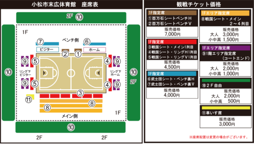ベンチ裏席、コートサイド2列目以降の座席を1F自由席からエリア指定席に変更いたしました。