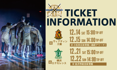 金沢武士団では、第12節VSヴィアティン三重戦および第13節VS横浜エクセレンス戦のチケット販売について、下記の概要にて販売を開始いたしますのでお知らせいたします。
