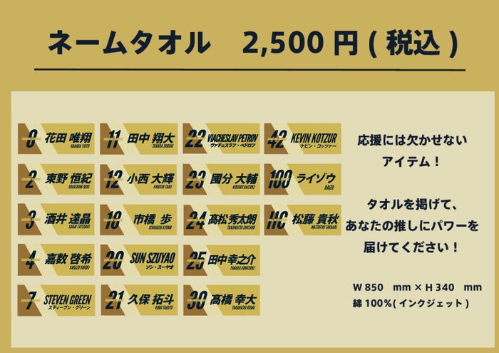 また、金沢武士団オンラインショップ、ホームゲーム会場にて「 2024-25 選手ネームタオル 」の受注受付を開始することとなりました。
