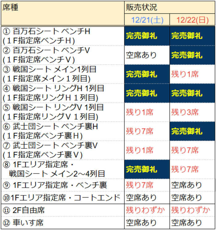 おかげさまで1階席は多くの席種で完売、または完売間近となりました。