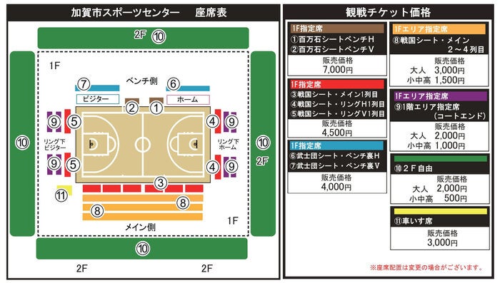 ベンチ裏席、コートサイド2列目以降の座席を1F自由席からエリア指定席に変更いたしました。