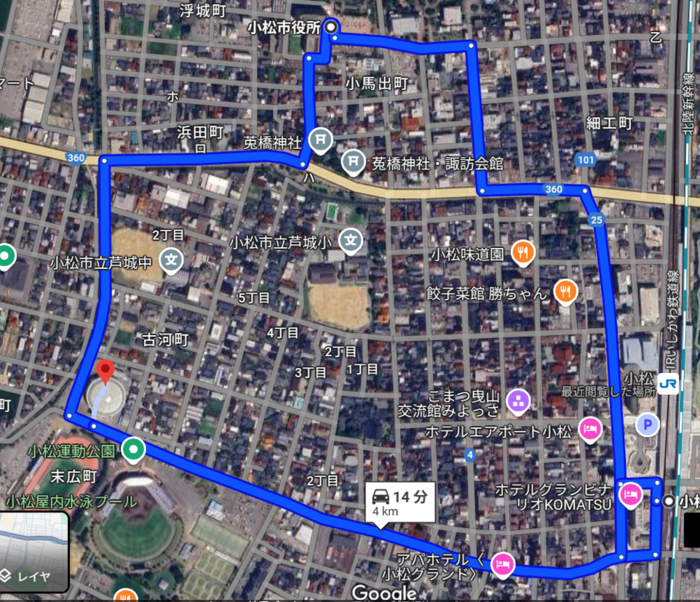 ▶︎ 行程:末広体育館 → 小松市役所 → 小松駅 → 末広体育館