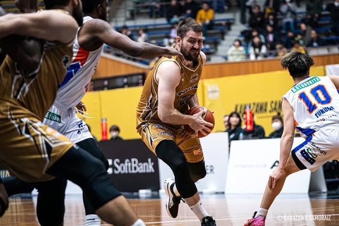 自分たちのミスから苦しい立ち上がりにしてしまう。松藤HCはタイムアウトを要求し、立て直しを図る。#23國分大輔のジャンパーや#42ケビン・コッツァーがリバウンドシュートと3Pシュートを沈める。さらに、#7スティーブン・グリーンの連続ポイントで主導権を握り返す。第3Qが終了して75-61でリードを広げる。