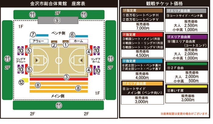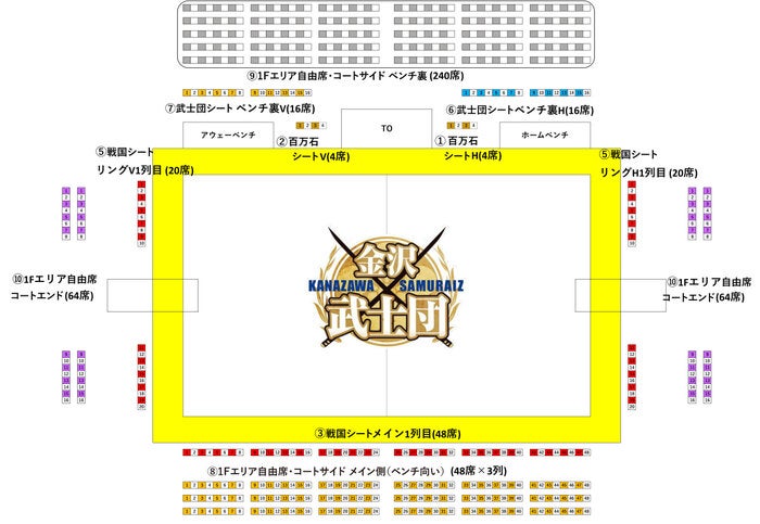 ベンチ裏席、コートエンド2列目以降の座席を1F自由席からエリア自由席に変更いたしました。