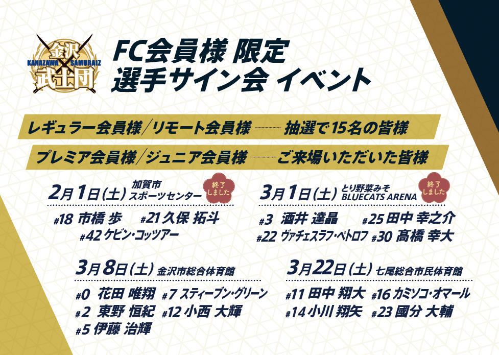 2024-25シーズン、ファンクラブ会員様対象のアリーナイベントである、選手サイン会のイベント後半スケジュールが決定しましたので、お知らせいたします。