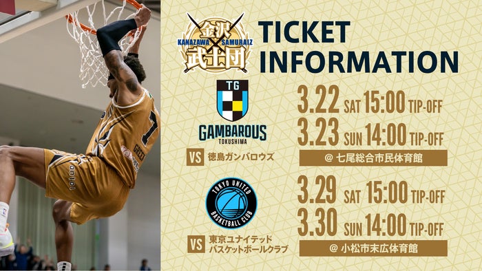 金沢武士団では、第26節VS徳島ガンバロウズ戦および第27節VS東京ユナイテッドBC戦のチケット販売について、下記の概要にて販売を開始いたしますのでお知らせいたします。