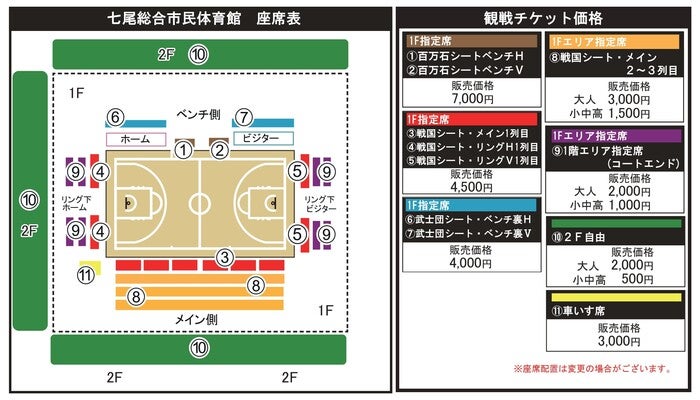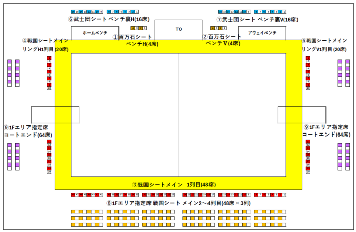 ベンチ裏席、コートエンド2列目以降の座席を1F自由席からエリア自由席に変更いたしました。