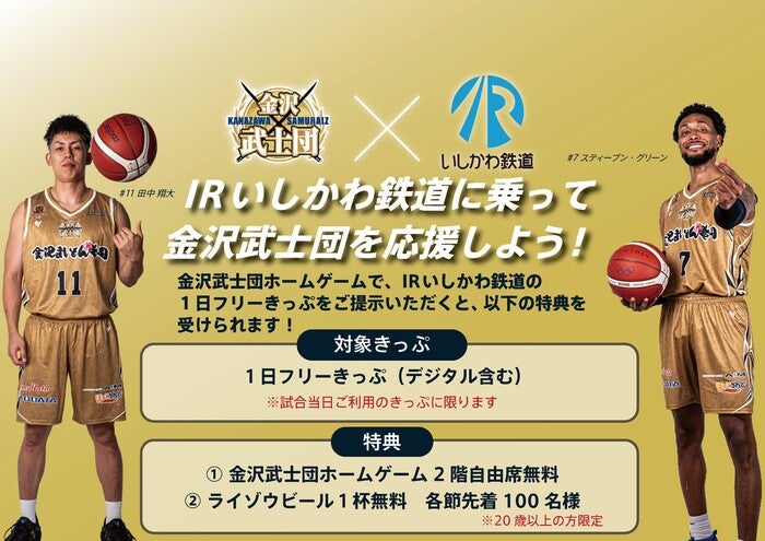 この度、IRいしかわ鉄道の利用促進および金沢武士団のホームゲーム集客促進を目的として、IRいしかわ鉄道とのタイアップ事業を実施することが決定しましたので、お知らせいたします。