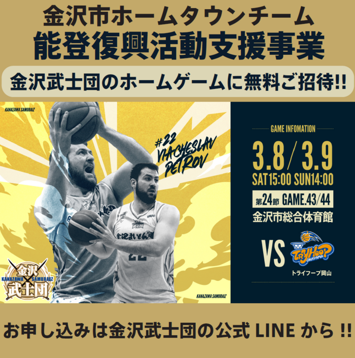 本企画は、「 金沢市ホームタウンチーム能登復興活動支援 」事業で金沢市ご協力のもと実施いたします。ぜひ皆様のご来場を心よりお待ちしております。