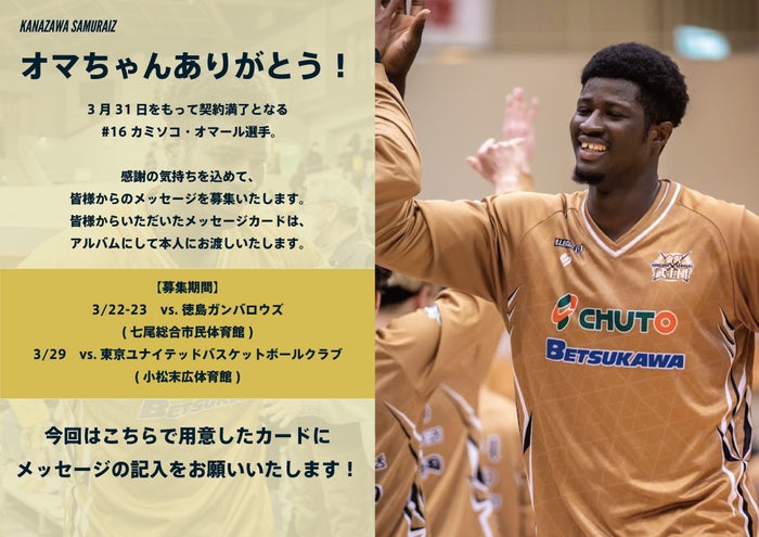 今節は、3月31日をもって契約が満了となる#16 カミソコ・オマール選手へ、感謝の気持ちを込め、この度ご来場いただいた皆様からメッセージカードを募集いたします💌会場内に設置してあるブースにて、指定のメッセージカードへご自由にメッセージをご記入いただき、ポストへ投函してください📮後日、皆様からいただいたメッセージをアルバムにし、オマちゃんにプレゼントいたします。