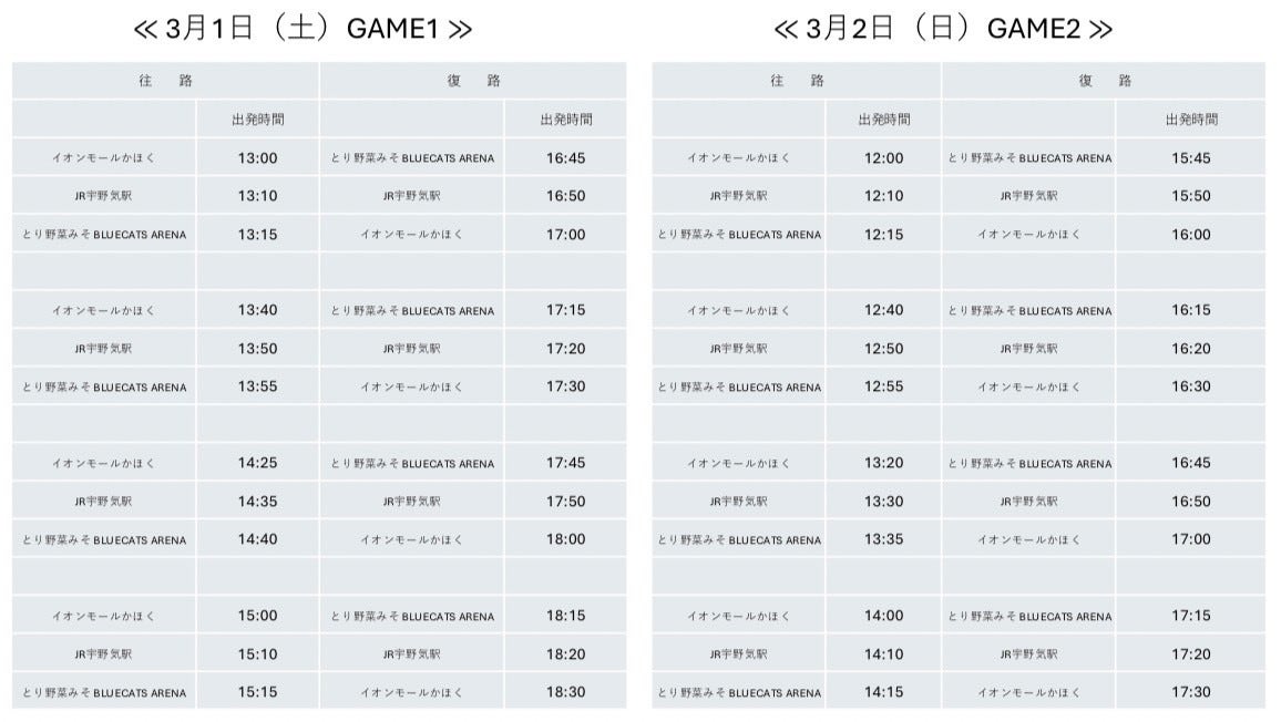 この度金沢武士団では、3月1日(土)2日(日)に、とり野菜みそBLUECATS ARENAにて開催される、第23節 さいたまブロンコス戦にて、無料シャトルバスの運行が決定しましたのでお知らせいたします。