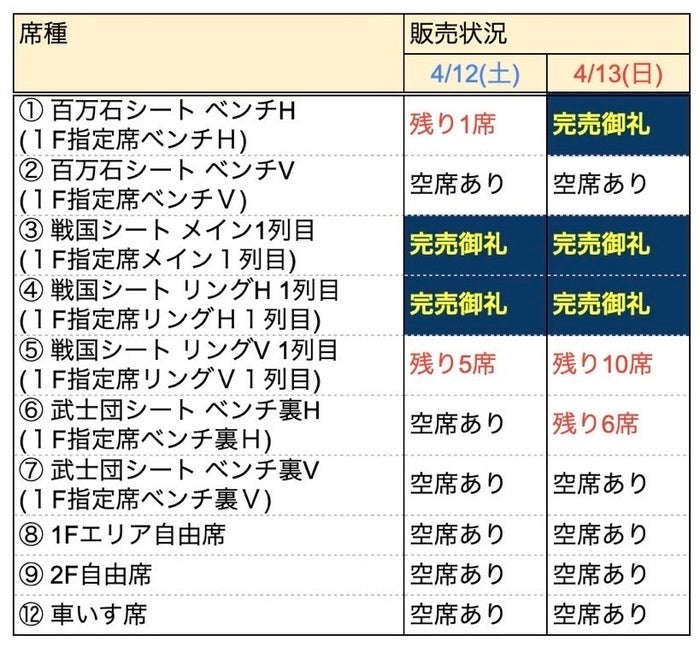 ⬛︎ 第27節のチケット販売状況( 3/27(木)時点 )