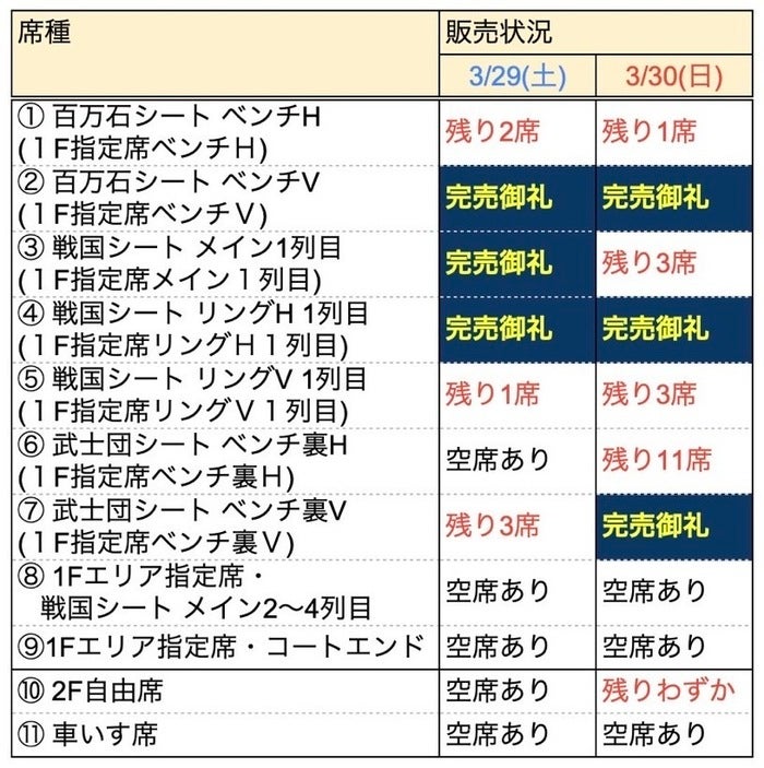 ⬛︎ 第29節のチケット販売状況( 3/27(木)時点 )