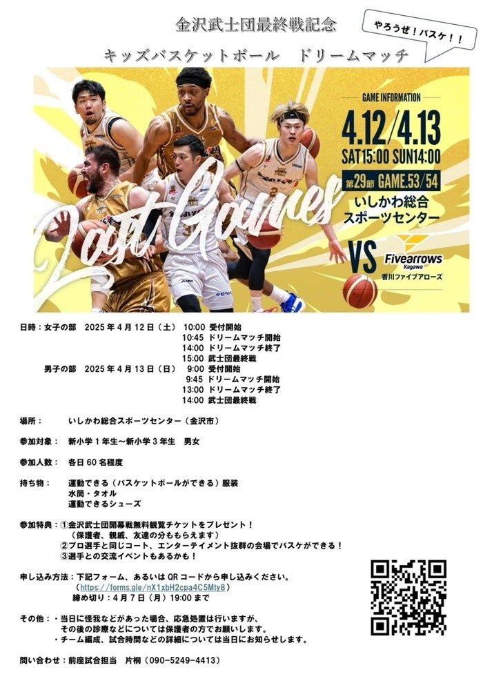 この度、金沢武士団では最終節の第29節VS香川ファイブアローズ戦、エキシビションマッチにて ” キッズバスケットボールドリームマッチ ” を開催することが決定しましたので、お知らせいたします。