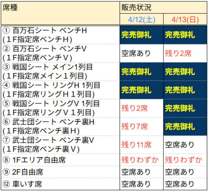 ⬛︎ 第29節のチケット販売状況( 4/8(火)時点 )