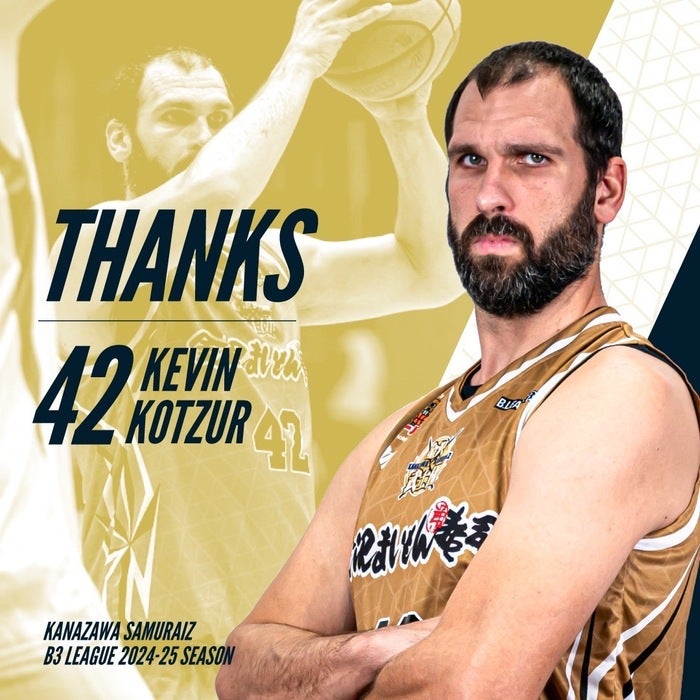 この度、金沢武士団では#42 ケビン・コッツァー選手との契約を、2025年4月13日(日)付けで解除し、退団することとなりましたのでお知らせいたします。なお、明日5月23日(金)15:00付けでB.LEAGUE自由交渉選手リストへ公示いたします。