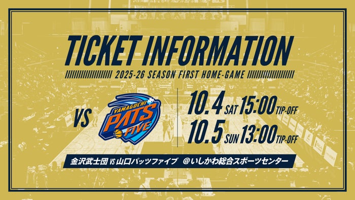 金沢サムライズでは、第2節VS山口パッツファイブ戦のチケット販売について、下記の概要にて販売を開始いたしますのでお知らせいたします。