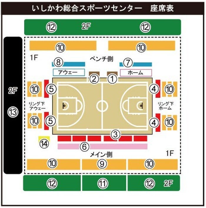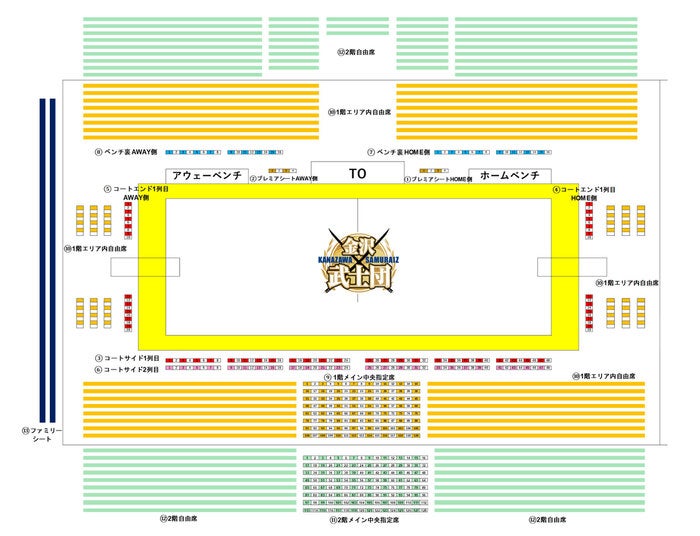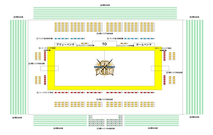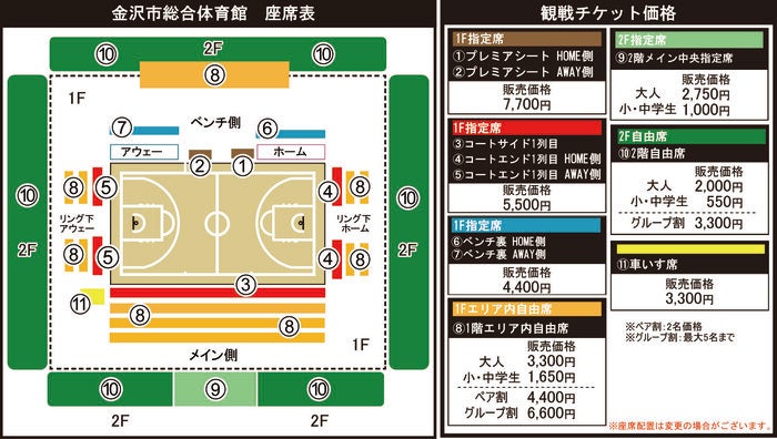 ※金沢市総合体育館はレイアウトの都合上、ファミリーシートおよび1階メイン中央指定席の設置はございません。